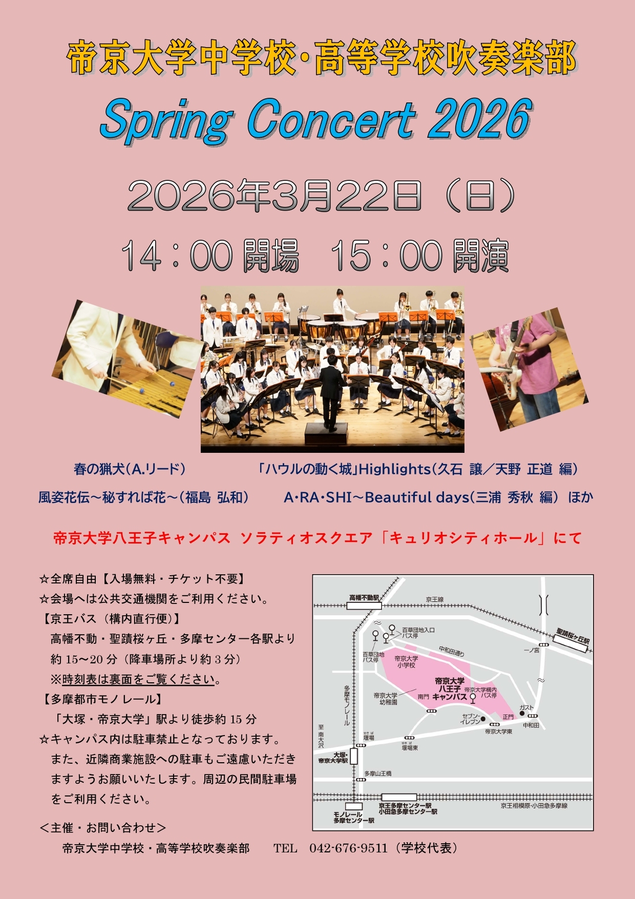 児童・保護者の皆様へ 本校吹奏楽部によるコンサートの開催を告知させて頂きます。是非、お越しください。 <内容> ・日時:2026年3月22日(日)開場14:00 / 開演15:00 ※入場無料(チケット不要) ・場所:帝京大学 八王子キャンパス SORATIO SQUARE「キュリオシティホール」 ・お問合せ:帝京大学中学校・高等学校吹奏楽部 顧問/櫻井 <TEL> 042-676-9511(学校代表) <E-mail> t-brass777@teikyo-u.ed.jp