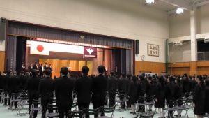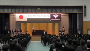 久しぶりに冷え込んだ空気の中、真新しい制服に身を包んだ中学1年生の生徒が登校しました。クラスも発表され、担任の先生に率いられて入場する生徒の顔は、やや緊張が見られたものの、皆明るい表情をしていました。